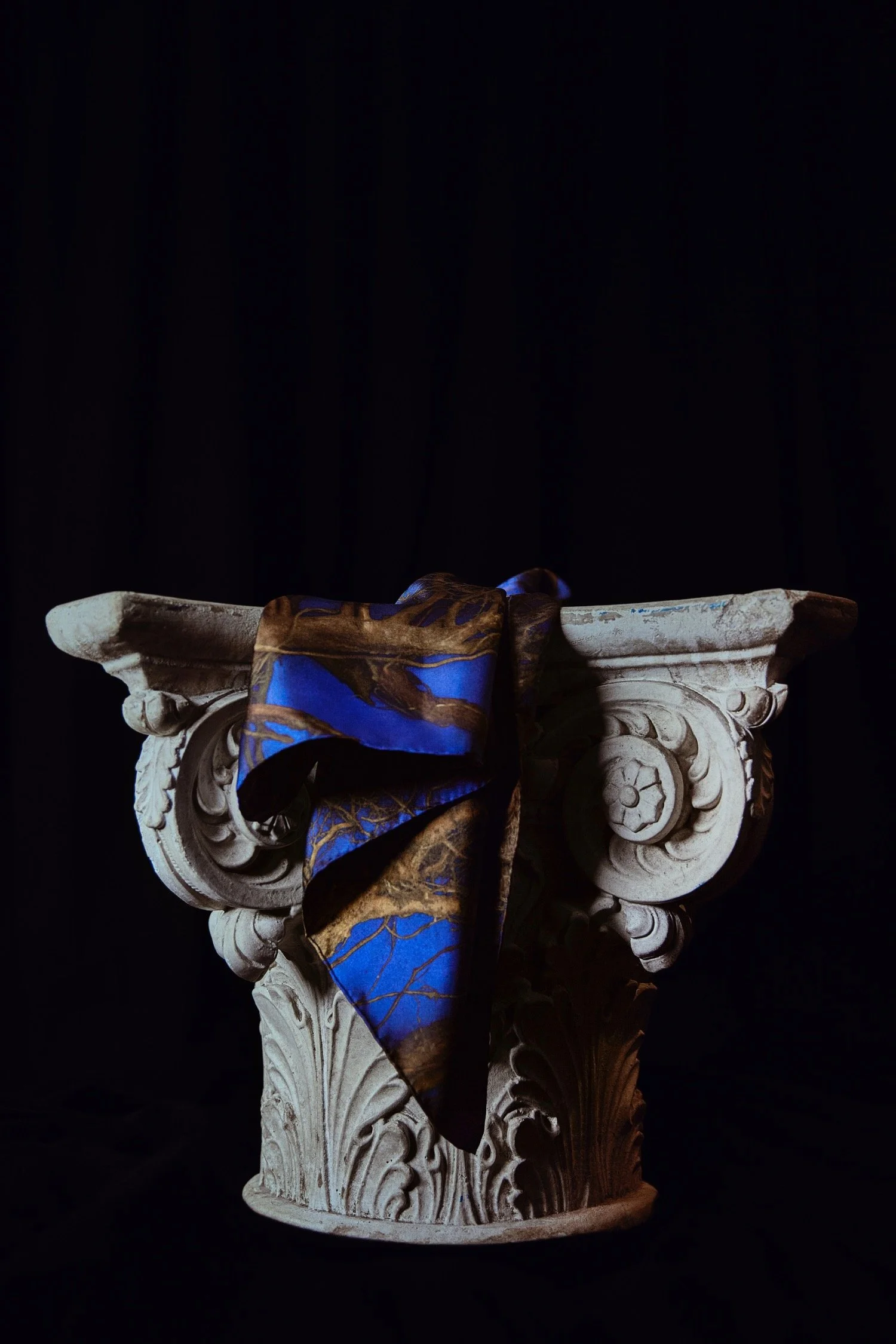 The scarves are made in silk twill with a French hem, and their size is 130X130. They are produced in Northern Italy. Each scarf is a piece of art that can be worn in different modes, or framed and put on the wall.