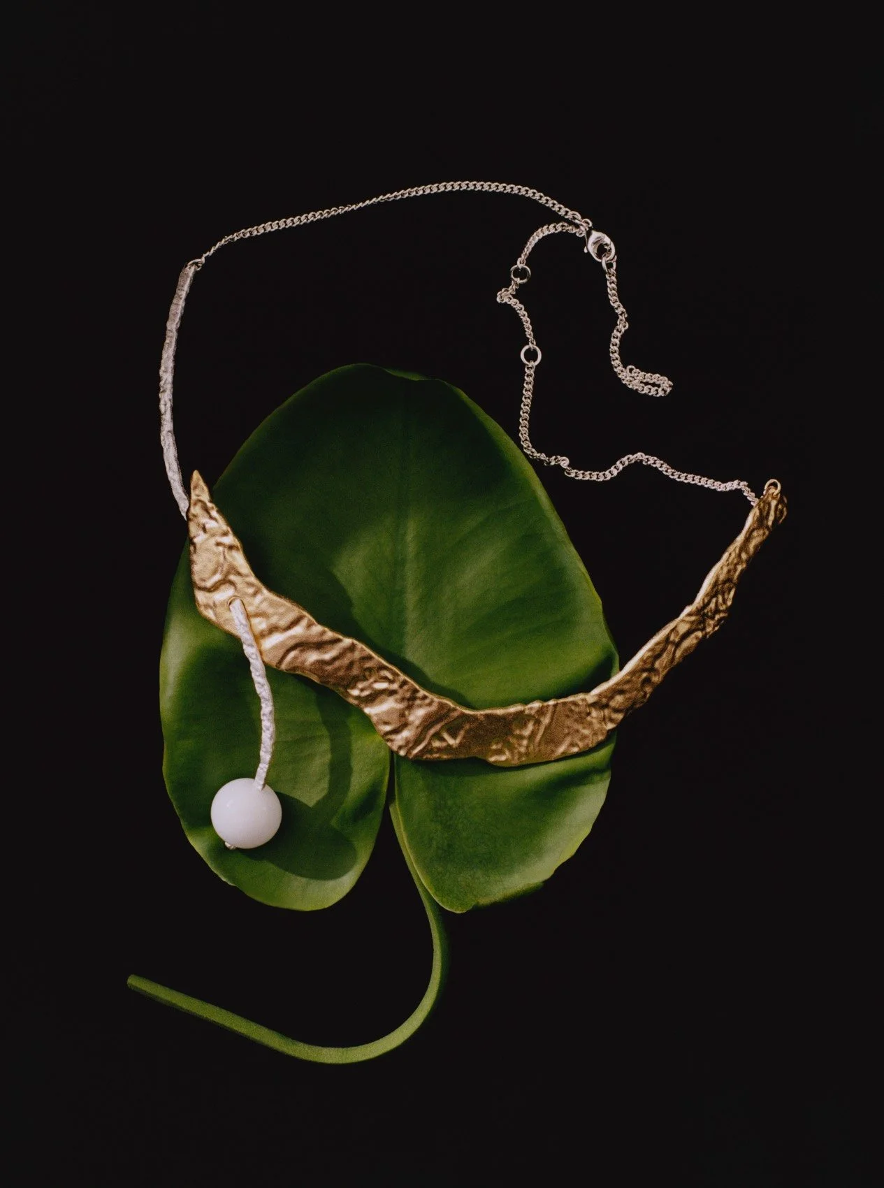 The series includes a statement necklace and earrings, as well as smaller jewelry and charms that can be combined in countless ways. Personalize your jewelry by adding the charm of your choice – a seed, a pearl, or an engraving plate.
